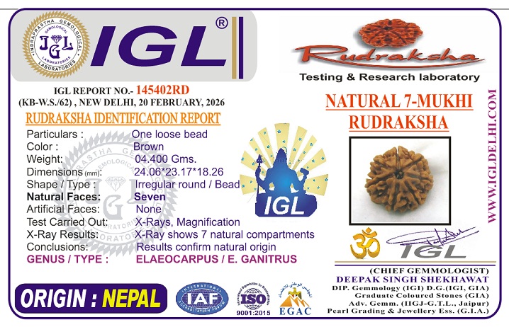 Seven Mukhi Rudraksha represents the Goddess Mahalaxmi, ruled by the planet Saturn and has a life of a thousand years if well taken care of. The wearer of this Rudraksha reaps the positive benefits of huge financial gains, good health, fame, peace, freedom from diseases and mental stress.