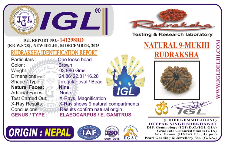 Nine Mukhi Rudraksha stimulates mind and body, enhances mental sharpness and alertness, increases physical strength, concentration power, patience and control over one’s anger and enhanced communication skills. The wearer is also blessed with the grace and power of Bhairava and attains fearlessness and pleasures of family life. Nine Mukhi Rudraksha is essential for the worshipper of Shakti. The wearer is blessed with energy, fame, respect, dynamism and a successful life.